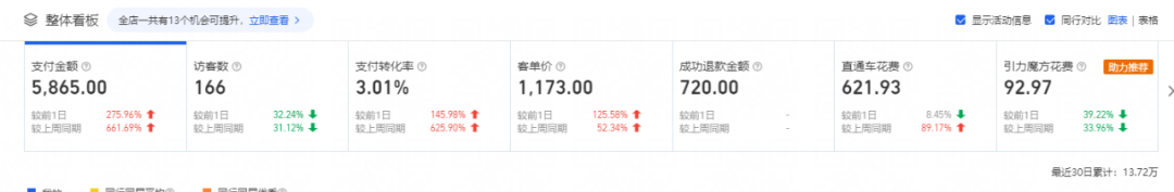 1.付費板塊投入不大,只做了付費的直通車引力魔方基礎模塊 店鋪新客成交少;