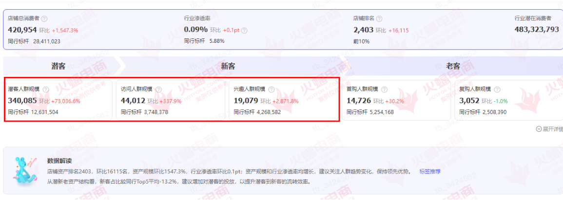 及時處理退款售后,加快物流和發(fā)貨攬收速度,提升店鋪DSR評分。針對用戶消費(fèi)情緒,火蝠電商更是做好了店鋪用戶體驗管理舉措,及時做好安撫,適當(dāng)折扣讓利,減少差評和“問大家”板塊等負(fù)面內(nèi)容的影響。截至十月下旬,品牌店鋪潛/新客資產(chǎn)結(jié)構(gòu)得到明顯優(yōu)化。潛客人群規(guī)模超過34萬,店鋪總消費(fèi)人次超過42萬。